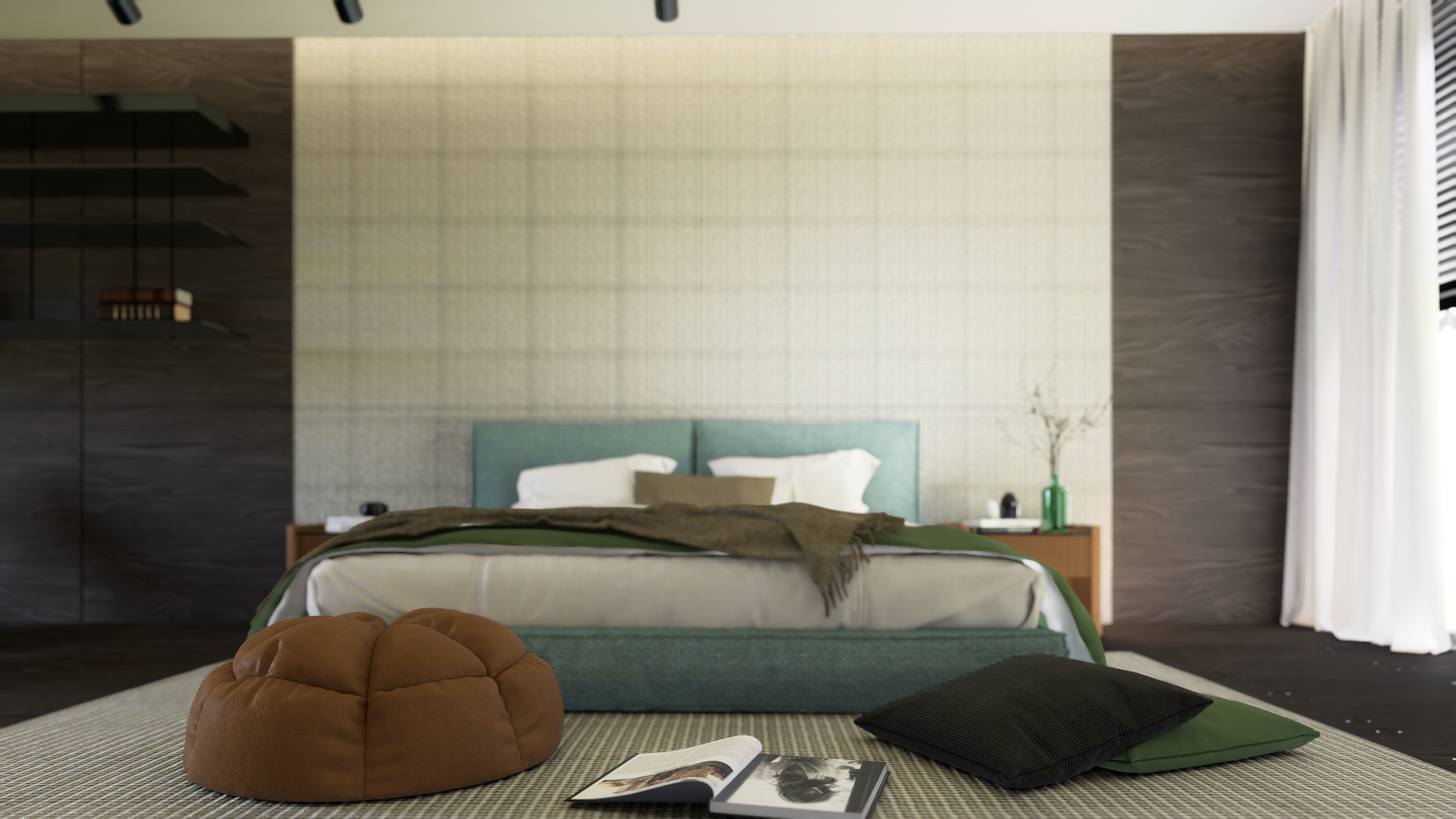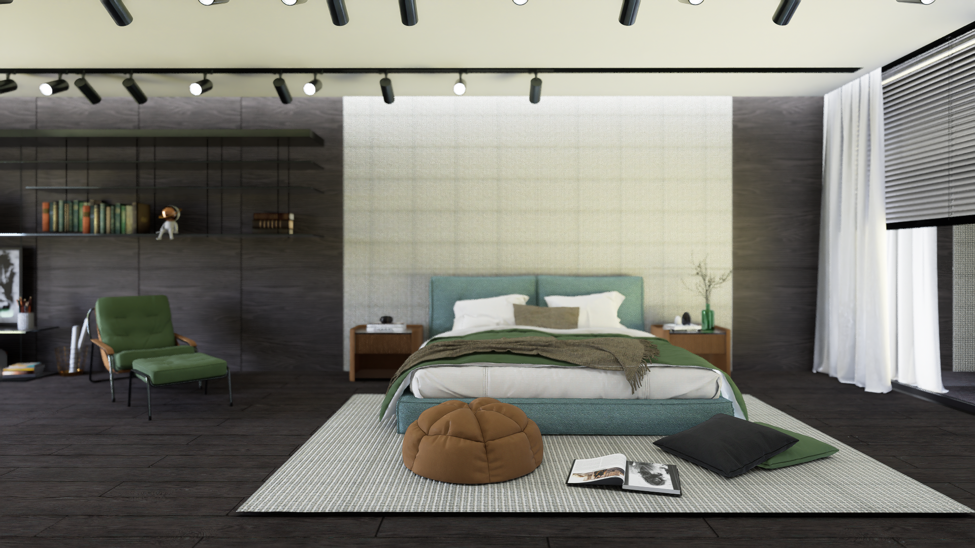 Un dormitorio contemporáneo que combina tonos cálidos y frescos para crear un ambiente acogedor y equilibrado. La cama tapizada en azul es el punto focal, complementada con detalles naturales como la manta en verde olivo y las texturas suaves. Los muebles de madera añaden calidez, mientras que las luces dirigidas resaltan los elementos clave de la habitación.
