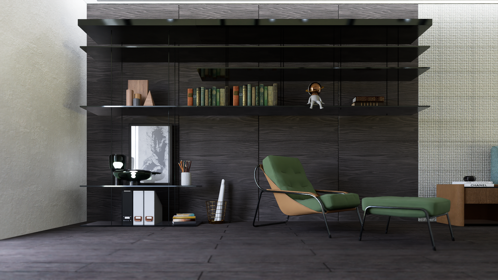 La silla verde con reposapiés y la estantería flotante aportan funcionalidad y diseño, perfectos para un espacio de descanso o lectura.